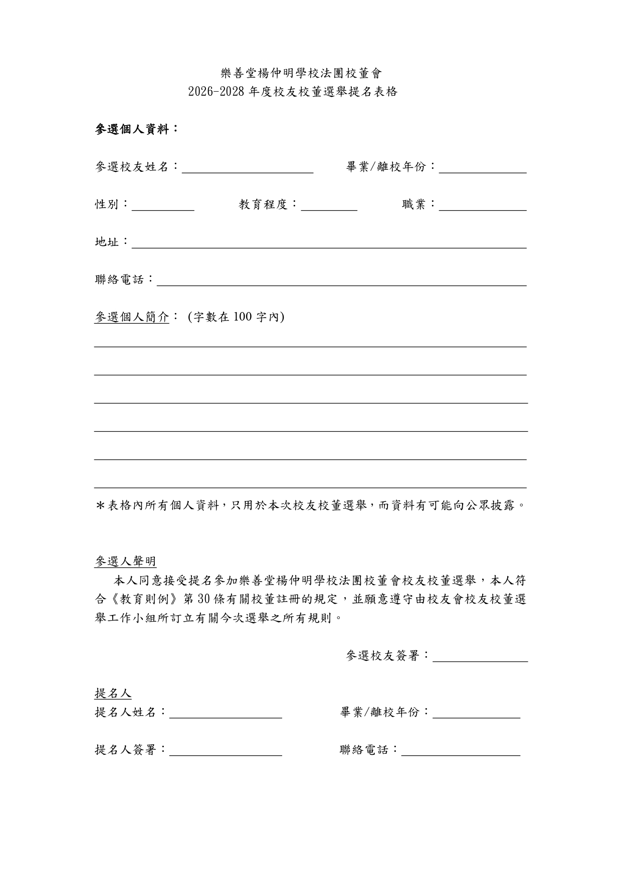 樂善堂楊仲明學校法團校董會選舉候選人、選舉日程、選舉提名及參選表格