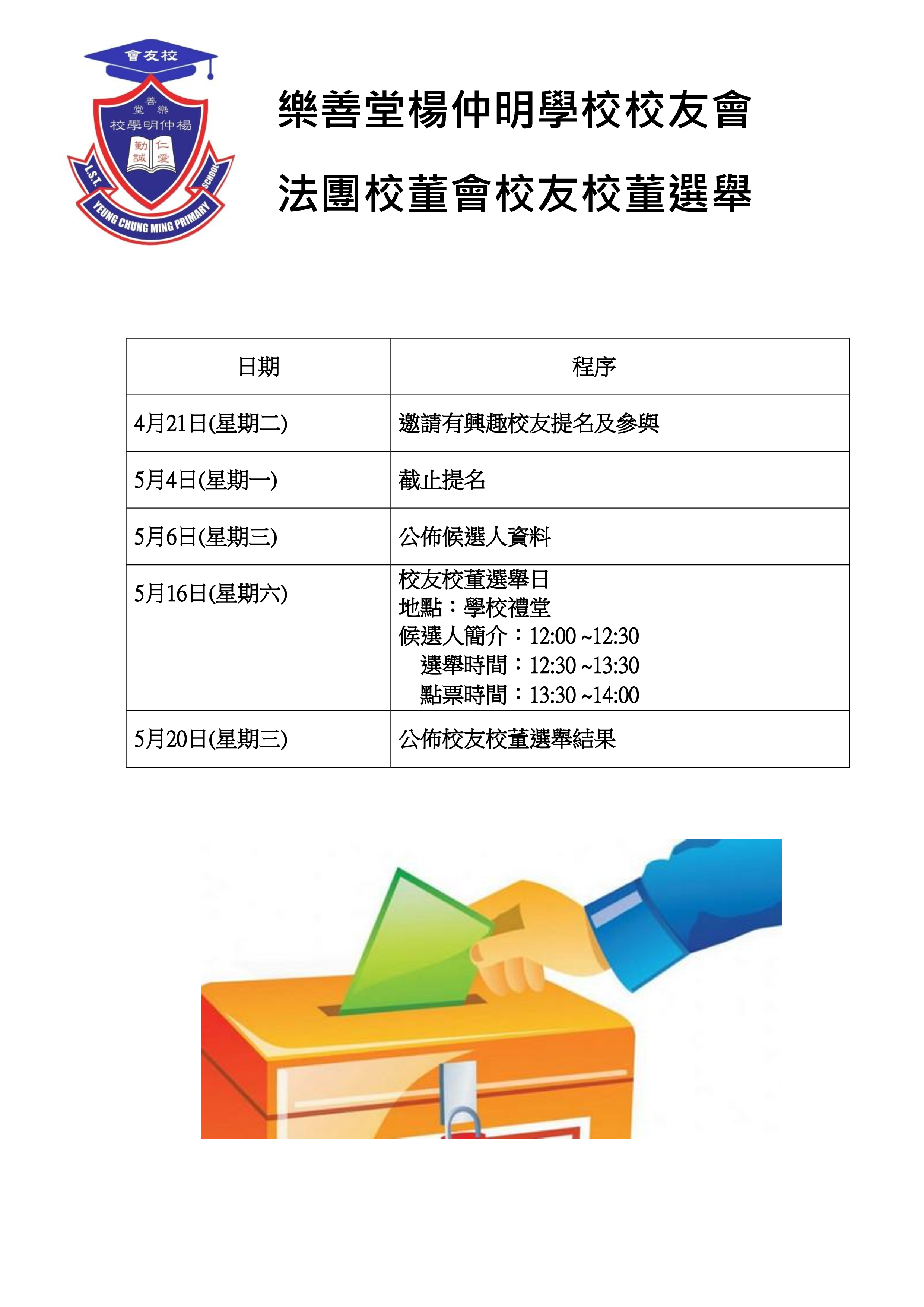 樂善堂楊仲明學校法團校董會選舉候選人、選舉日程、選舉提名及參選表格